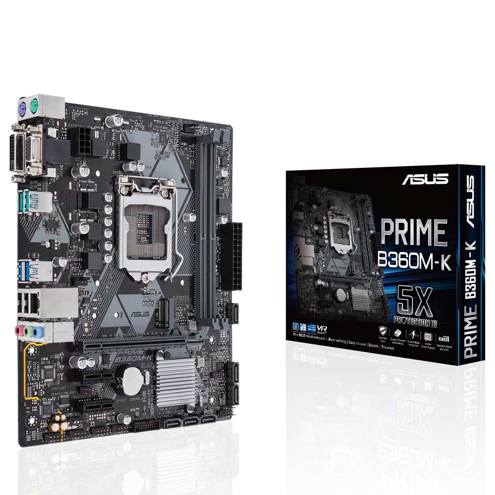 مادربرد میان رده با قیمت مناسب ASUS PRIME B360M-K با کاربرد اداری و گیمینگ میباشد که با توجه به سوکت پردازنده LGA1151 و چیپ ست B360 قابلیت نصب سی پی یو های اینتل نسل 8 و 9 را دارد .